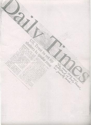 This news story was published in the Daily Times, On June 18, 2006. Taleh Mehdi, Chairman of Al-Ain International Trust UK said "About 100 metal shelters will be set up in the quake hit areas of Batagram, Balakot, Manashera, Bagh, Muzzaffarabad and Chattarplain.